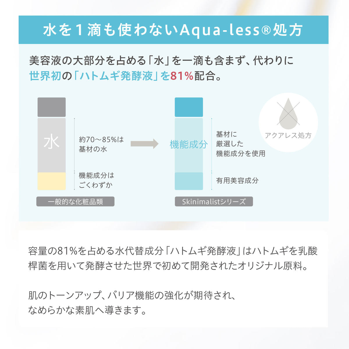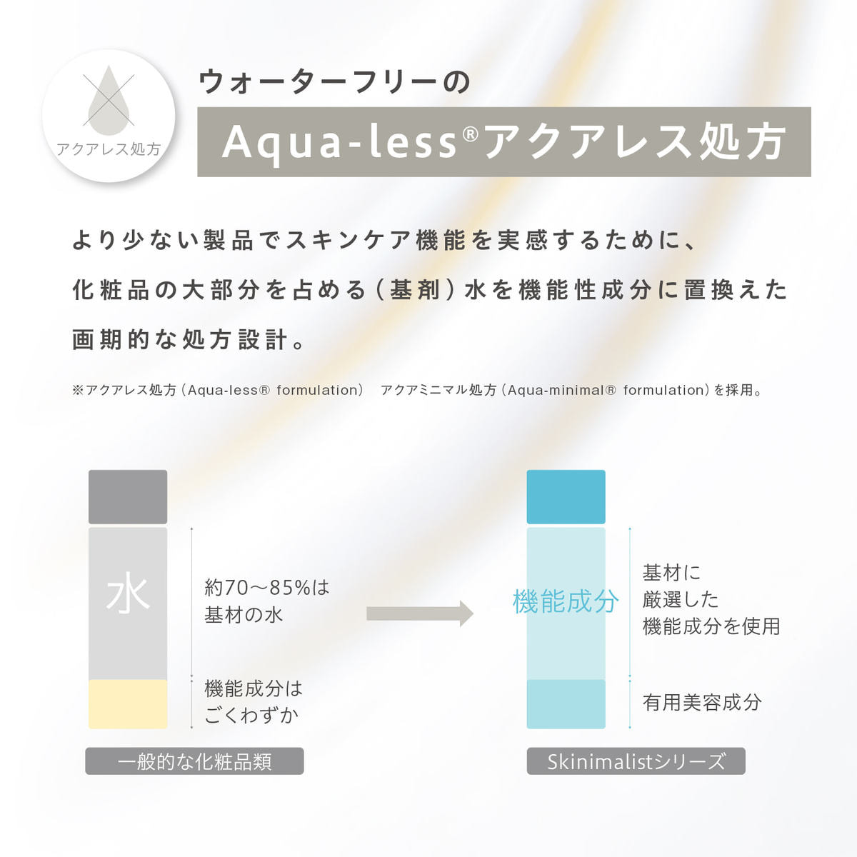 世界的に注目が集まるSkinimalism*( スキニマリズム)実現のために最新の美容成分を厳選し、新処方である“水を一滴も含まない”Aqua-less®(アクアレス)処方を採用。