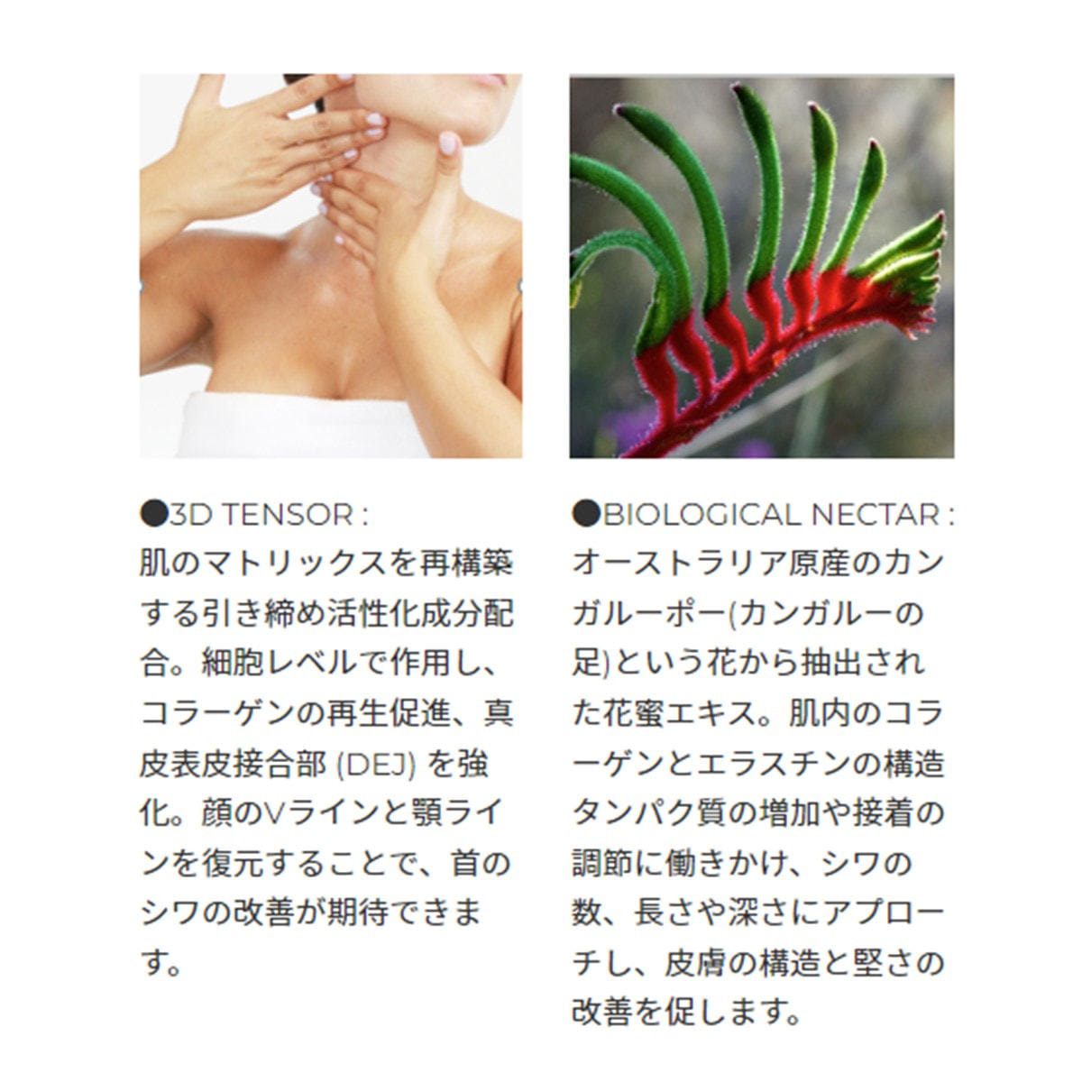 注目成分のカンガルーポー(アニゴザントスフラビデュスエキス)は、オーストラリア原産の花から抽出された花蜜エキスで、首周辺の皮膚の構造にアプローチします。