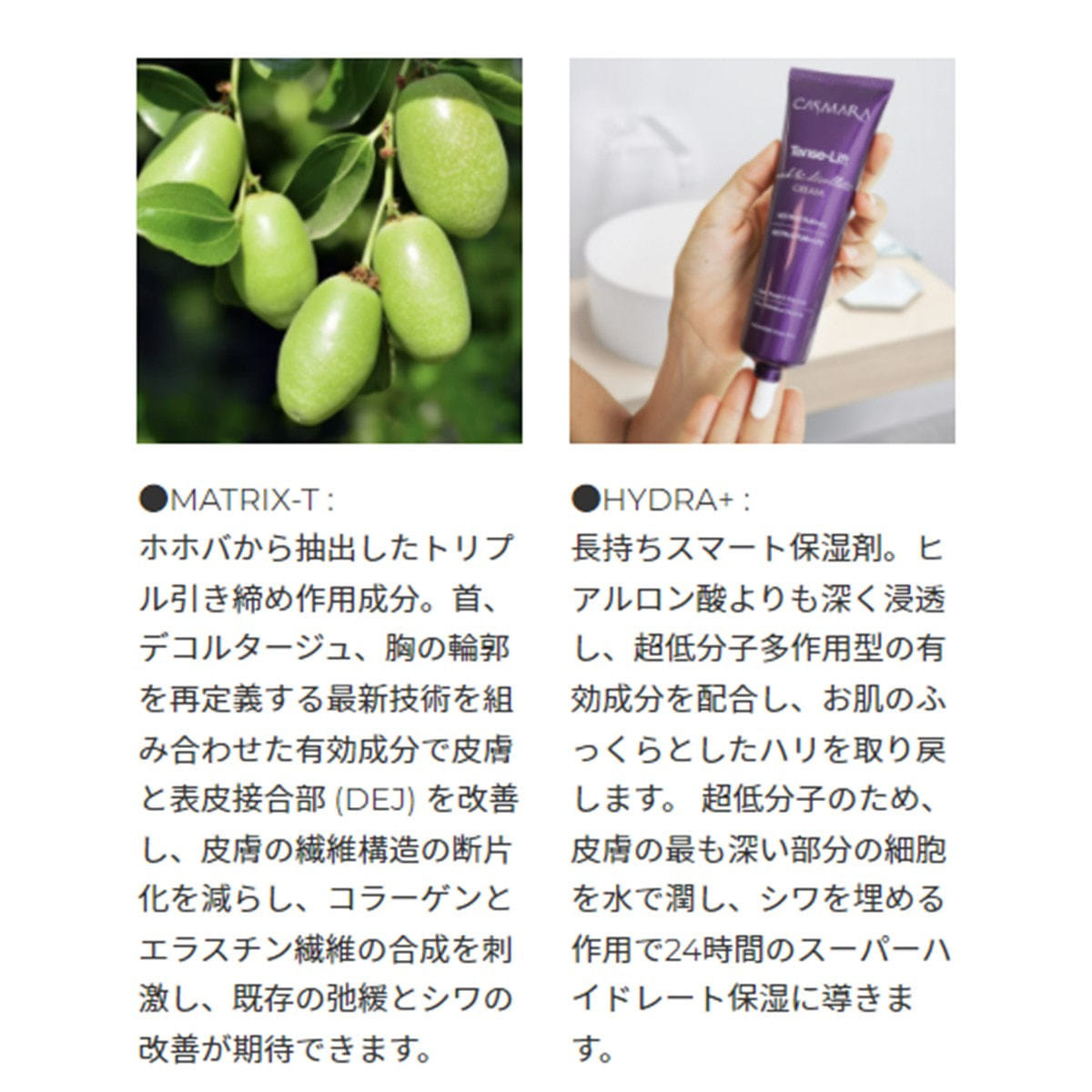種子エキス(ホホバ、マカデミア)、100%植物由来の混合成分(ヒマワリ種子ロウ、ホホバエステル、フサアカシア花ロウ)配合によるべたつきのない潤いで、首周辺、デコルテに現れる乾燥シワにアプローチします。