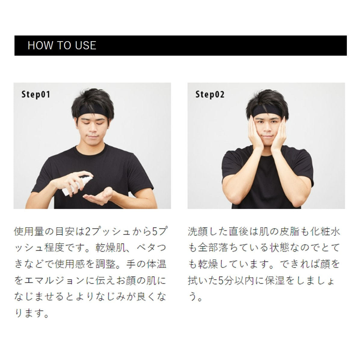 ①使用量の目安は2プッシュから5プッシュ程度です。乾燥肌、ベタつきなどで使用感を調整。