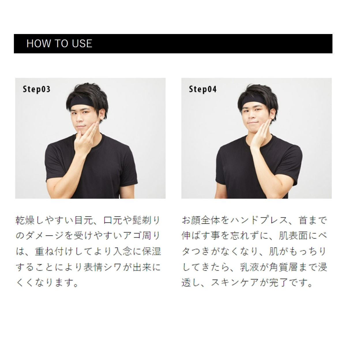 ③乾燥しやすい目元、口元や髭剃りのダメージを受けやすいアゴ周りは、重ね付けしてより入念に保湿することにより表情シワが出来にくくなります。