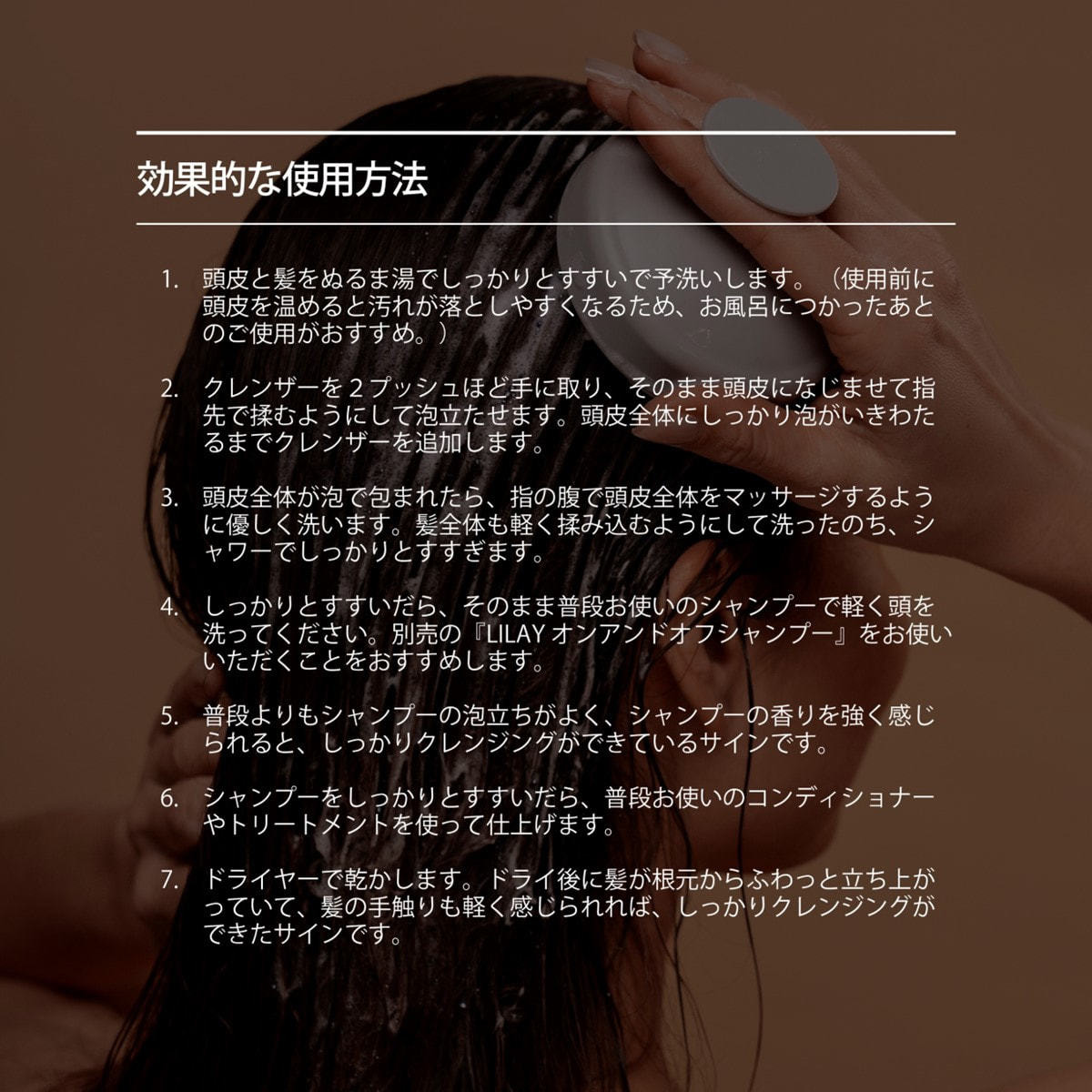 毎⽇のシャンプーだけでは落ちきらず頭⽪、⽑⽳、⽑髪に少しずつ溜まってしまった堆積汚れをしっかり落とす、無⾹料のリキッドフォームタイプのクレンザー。