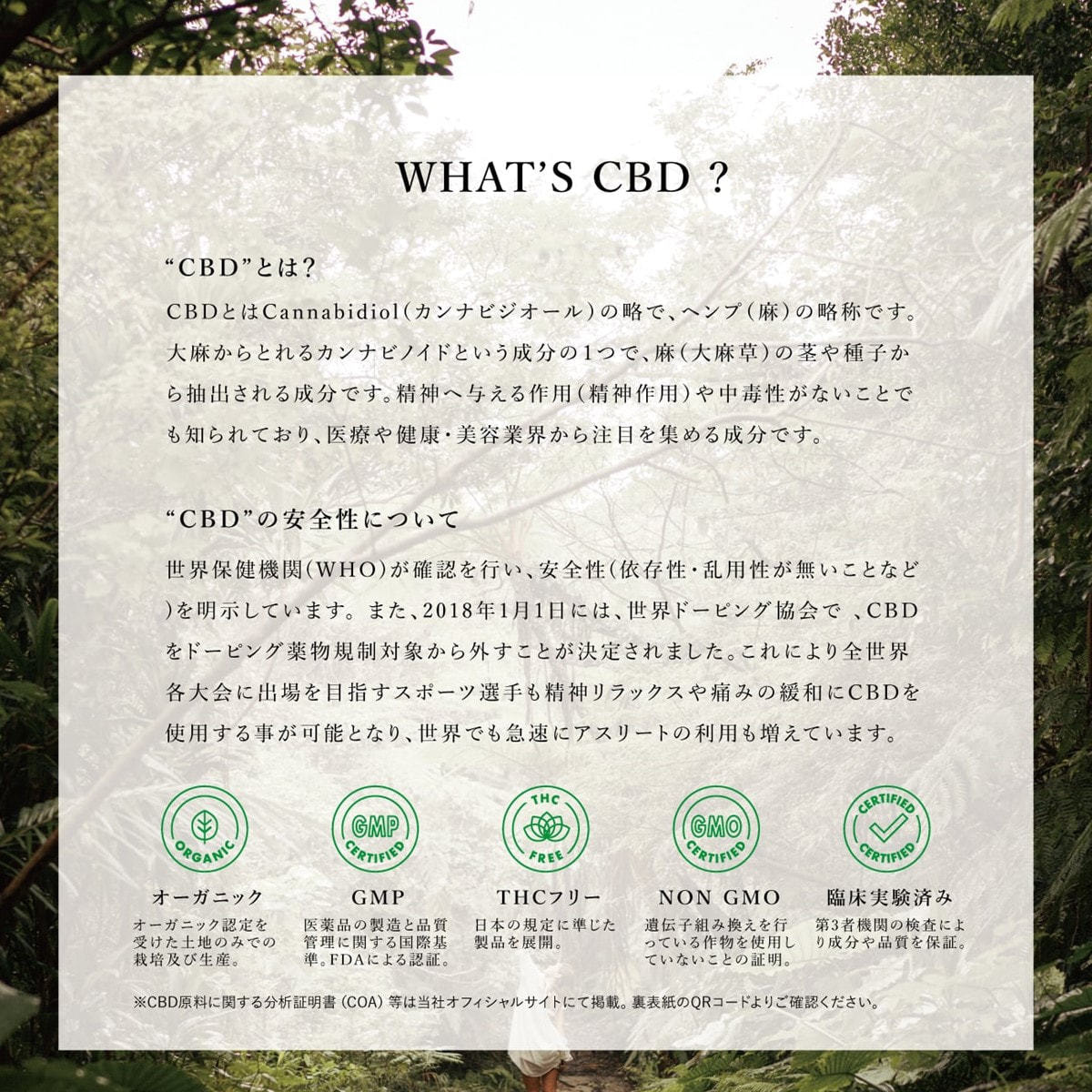 シクロペンタシロキサン、水、グリセリン、エタノール、ジメチコン、カンナビジオール、メトキシフェニルイミノジメチルシクロヘキセニルエチルグリシン、ペンタクレスラマクロロバ種子油、アルガニアスピノサ核油、マカデミア種子油、イソステアロイル加水分解コラーゲン、メドウフォーム-δ-ラクトン、アセチルグルコサミン、アセチルヒアルロン酸Na、加水分解ヒアルロン酸、アスパラギン酸Na、アラニン、アルギニン、イソロイシン、グリシン、グルタミン酸、セリン、チロシン、トレオニン、バリン、ヒスチジンHCl、フェニルアラニン、プロリン、リシンHCl、ロイシン、タウリン、シアノコバラミン、アラントイン、パーム油、グリチルリチン酸2K、イソステアリン酸、イソステアリン酸イソプロピル、ポリヒドロキシステアリン酸エチルヘキシル、PCA-Na、トコフェロール、ジエチルアミノヒドロキシベンゾイル安息香酸ヘキシル、t-ブチルメトキシジベンゾイルメタン、メトキシケイヒ酸エチルヘキシル、クエン酸、クエン酸Na、イノシン酸2Na、グアニル酸2Na、香料