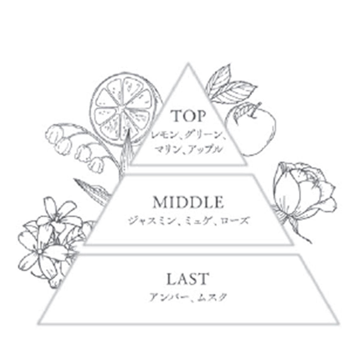 爽やかなミントグリーンから始まり、ふんわりと花咲くジャスミンやローズの自然な優しさに