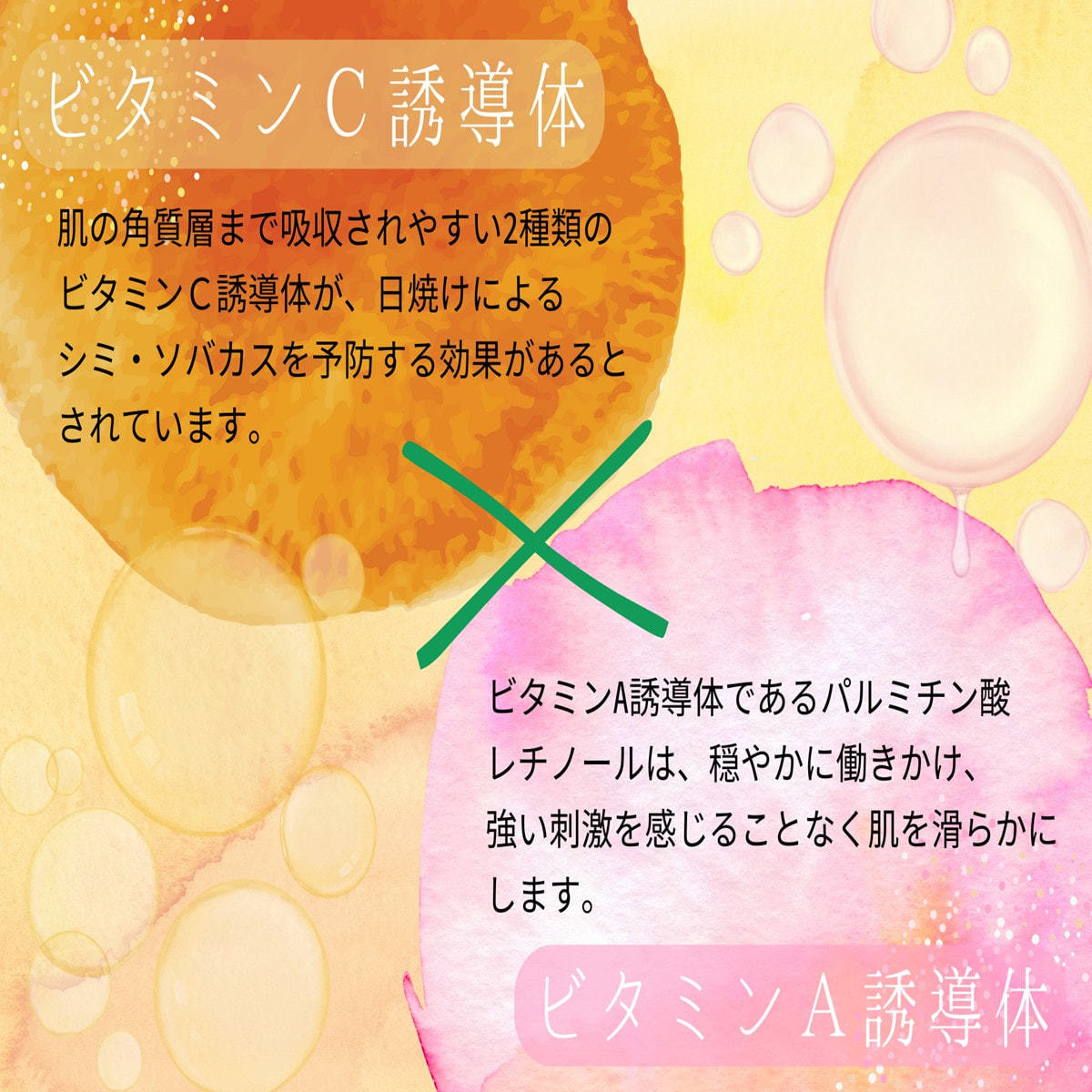 レチノールはお肌を健康に保ってくれる反面、刺激が強く、人によっては「皮むけ」「赤み」などの副作用がでることがあるからです。ナチュメディカのビタミンC&レチノールは、穏やかに働きかけるビタミンA誘導体の「パルミチン酸レチノール」を使用しています。