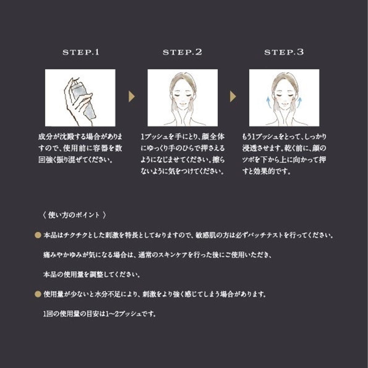 ●使用量が少ないと水分不足により、刺激をより強く感じてしまう場合があります。