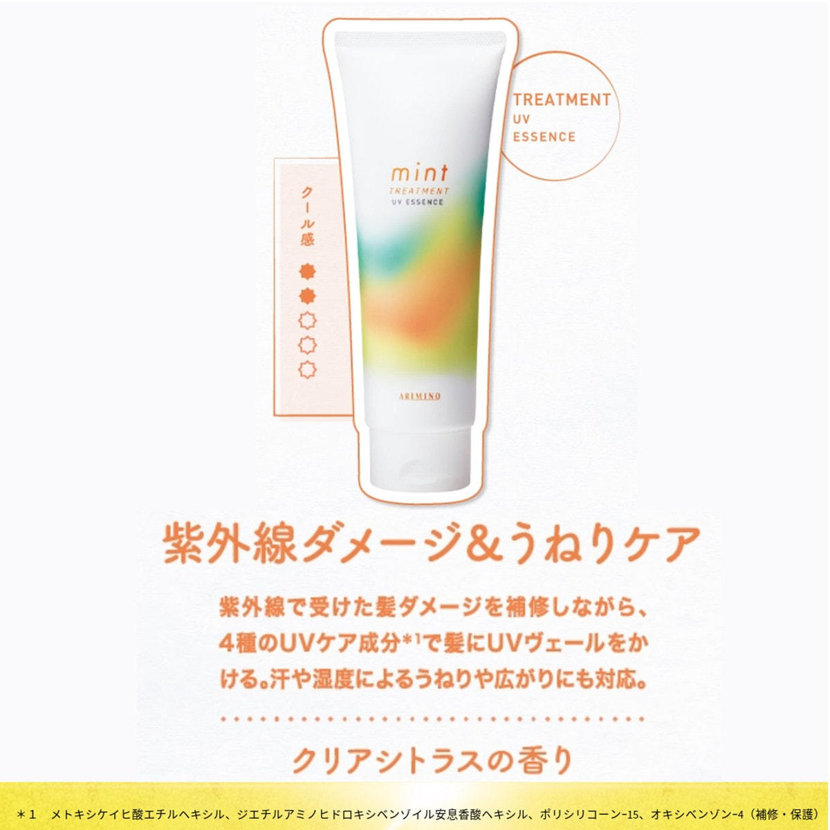 使用方法:トリートメントをつけた後に「ミント トリートメント UVエッセンス」を適量重ねづけをして流します。