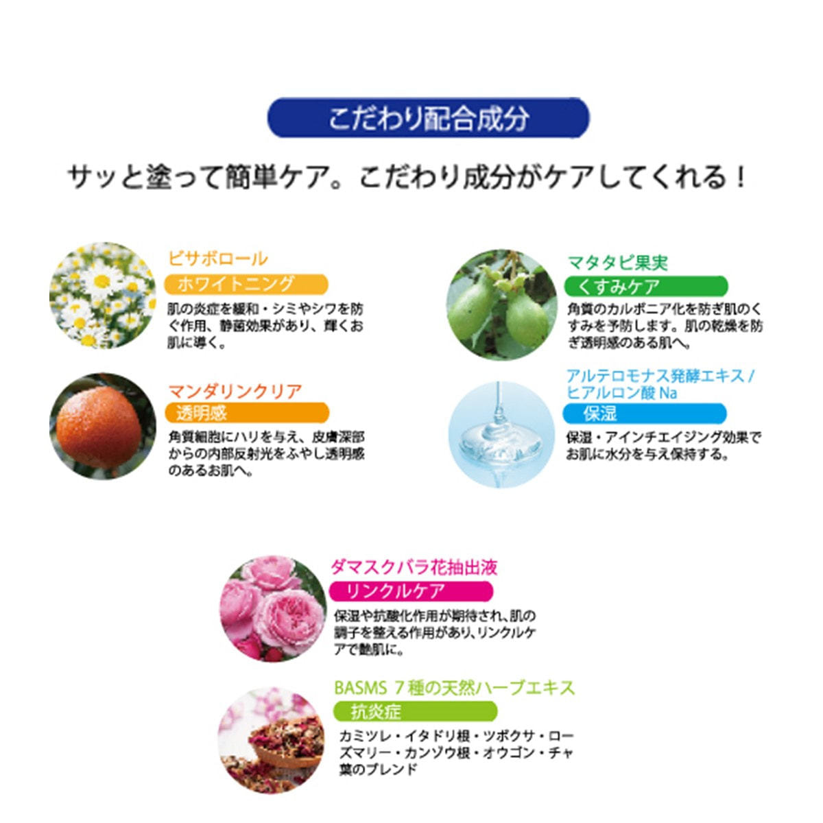 水、マイカ、シクロペンタシロキサン、酸化亜鉛、ジフェニルシロキシフェニルトリメチコン、カプリリルメチコン、イソノナン酸イソトリデシル、 ラウリルPEG−10トリス(トリメチルシロキシ)シリルエチルジメチコン、トリ(カプリル酸/カプリン酸)グリセリルPEG/PPG-19/19 ジメチコン、酸化チタン、BG、ツボクサエキス、マンダリンオレンジ果皮エキス、オウゴン根エキス、イタドリ根エキス、ビサボロール、カンゾウ根 エキス、チャ葉エキス、アセチルヒアルロン酸Na、ヒアルロン酸Na、加水分解ヒアルロン酸、ローズマリー葉エキス、カミツレ花エキス、マタタビ果実 エキス、ダマスクバラ花エキス、アルテロモナス発酵エキス、イソステアリン酸、セテス-10、ジメチコン、ミリストイルメチル−β−アラニン (フィトステリル/デシルテトラデシル)、硫酸Mg、水酸化Al、ステアリン酸、ステアリン酸イヌリン、グリチルレチン酸ステアリル、トコフェロール、ペンチレングリコール、フェノキシエタノール、ハイドロゲンジメチコン