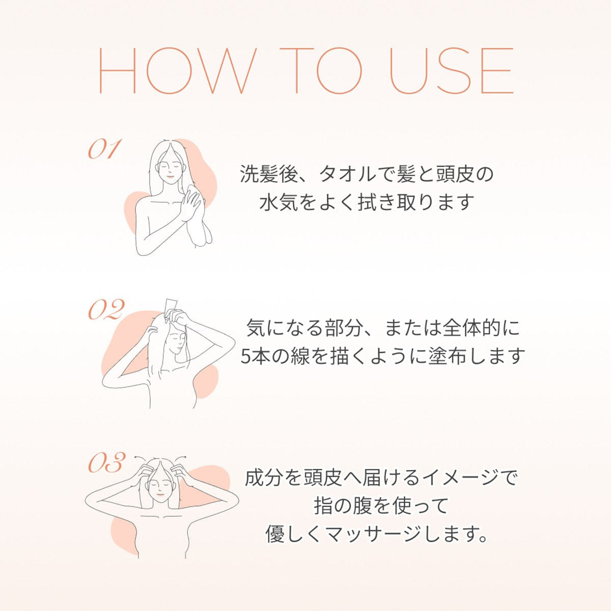 額から後頭部にかけて線を描くように塗布しながらスライドして揉みこみ。