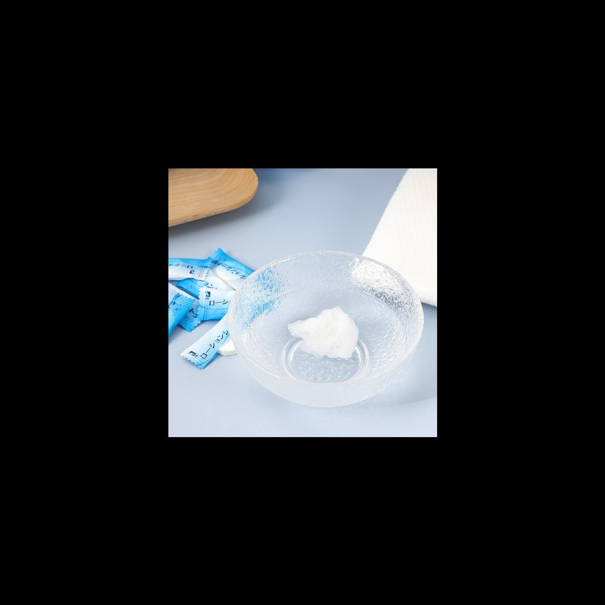 ①化粧水を化粧水のキャップなどに注ぎ、シートを1個入れます。