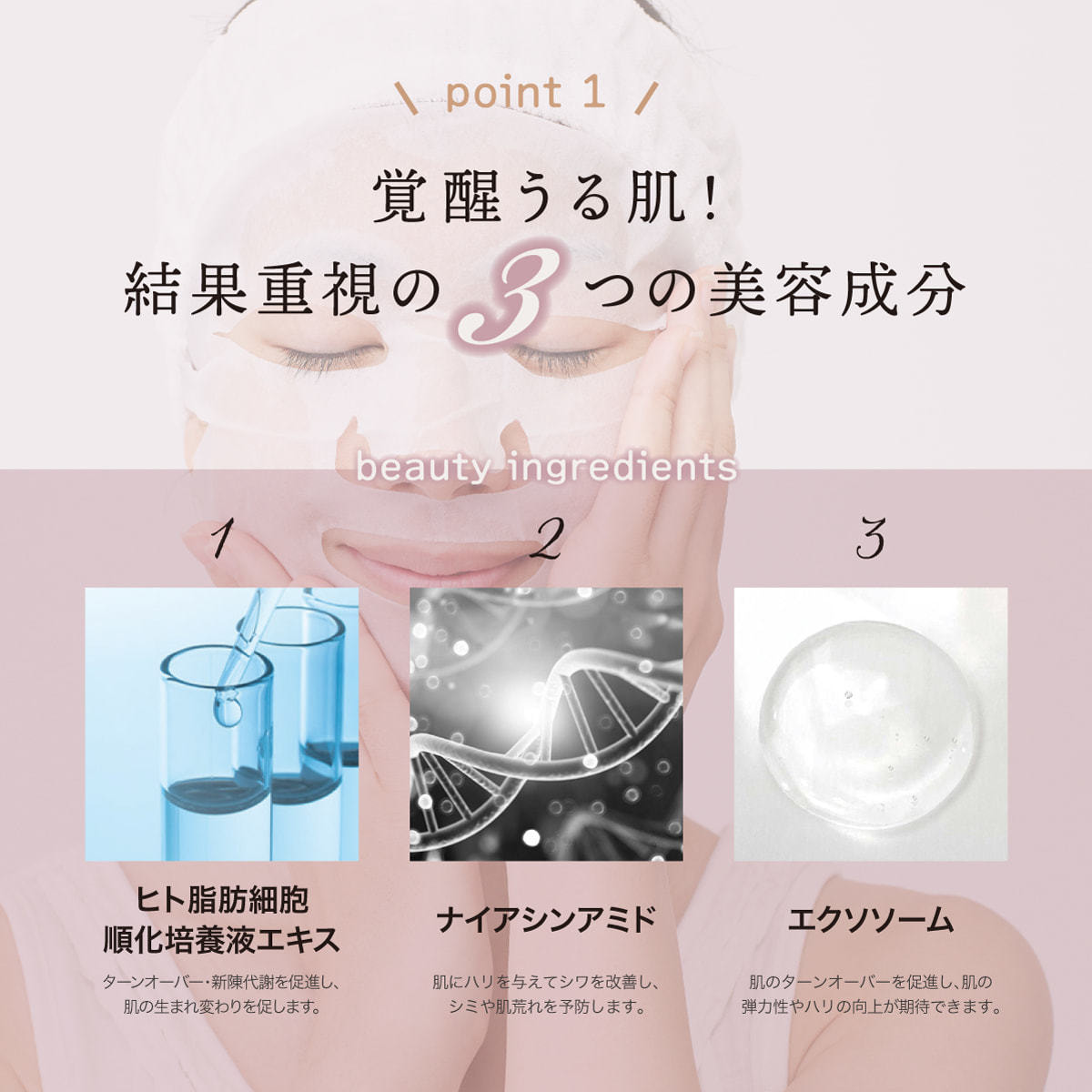 3つの成分を配合した、ふっくら弾潤美容液マスク。デイリー使いにぴったりな30枚入りで、業務用にも店販用にもおすすめです。