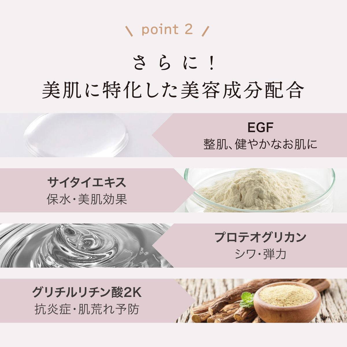 EGF(整肌)、サイタイエキス(保水、美肌効果)、プロテオグリカン(シワ、肌の弾力)、グリチルリチン酸2K(抗炎症、肌荒れ防止)