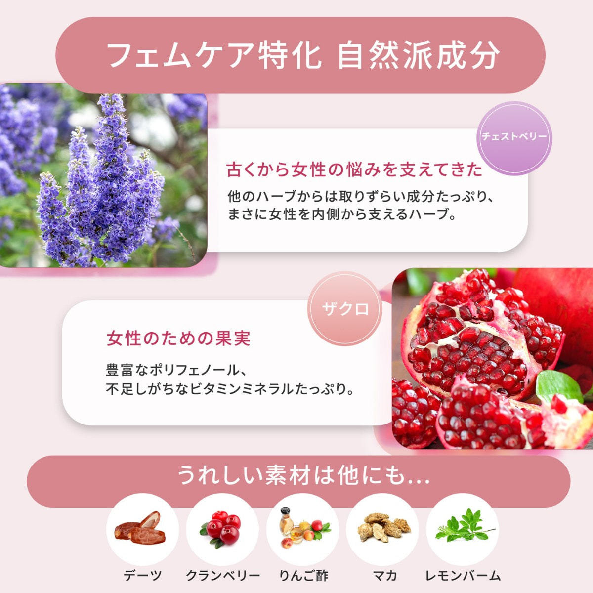 ザクロ濃縮果汁とチェストベリーエキスを中心に、トリプトファンやマカエキス、クランベリー果汁など、女性に必要な栄養素を厳選配合。