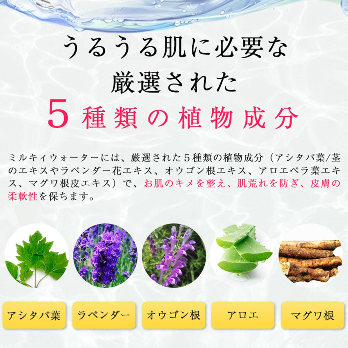 厳選された5種類の植物成分(アシタバ葉/茎のエキスやラベンダー花エキス、オウゴン根エキス、アロエベラ葉エキス、マグワ根皮エキス)で、お肌のキメを整え、肌荒れを防ぎ、皮膚の柔軟性を保ちます。