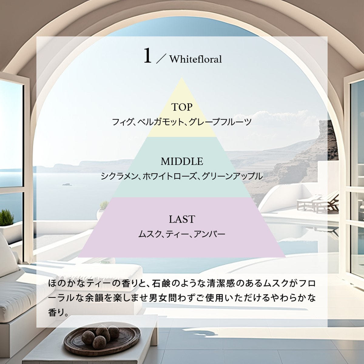 ほのかなティーの香りと、石鹸のような清潔感のあるムスクがフローラルな余韻を楽しませ男女問わずご使用いただけるやわらかな香り。